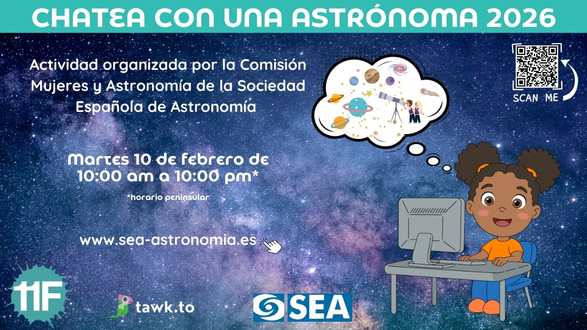 El martes 10 de febrero de 2026, de 10 de la mañana a 10 de la noche (horario de la Península Ibérica), tendrá lugar la IX edición de la actividad ‘Chatea con una Astrónoma’ en el marco del 11 de febrero: Día Internacional de la Mujer y la Niña en Ciencia. Esta actividad está organizada por la Comisión Mujeres y Astronomía de la Sociedad Española de Astronomía usando la plataforma Tawk.to.