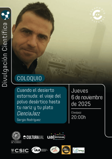 Llega una nueva charla CienciaJazz que organiza el Aula de Divulgación de la Universidad de Almería. En el mes de noviembre tendrá lugar el coloquio titulado Cuando el desierto estornuda: el viaje del polvo desértico hasta tu nariz y tu plato, a cargo de Sergio Rodríguez del Instituto de Productos Naturales y Agrobiología. IPNA-CSIC.