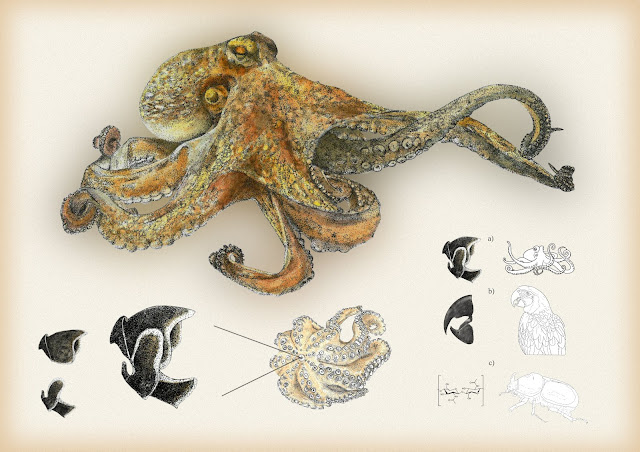 La exposición recoge una selección de 40 obras, dónde el diálogo entre observación científica y arte son el hilo conductor en esta disciplina. Cada ilustración nace para dar respuesta a una pregunta (de base científica), difusión a un hallazgo o soporte visual a la historia. La ilustradora almeriense Yolanda Ferrón Horcas, fue seleccionada con la obra “Pico de pulpo común (Octopus vulgaris), emblema de la convergencia evolutiva”. Esta pieza muestra en detalle la similitud en estructura y composición del pico de pulpo con especies diferentes.