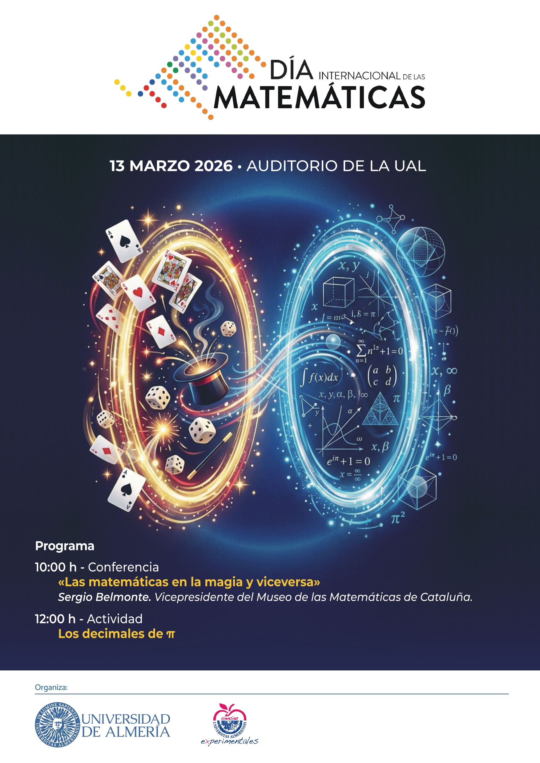 Con motivo del Día de las Matemáticas, que se conmemora el 14 de marzo, Día de Pi, la Facultad de Ciencias Experimentales de la Universidad de Almería organiza la conferencia ‘Las matemáticas en la magia y viceversa’, impartida por el profesor Sergio Belmonte, vicepresidente del Museo de Matemáticas de Cataluña.