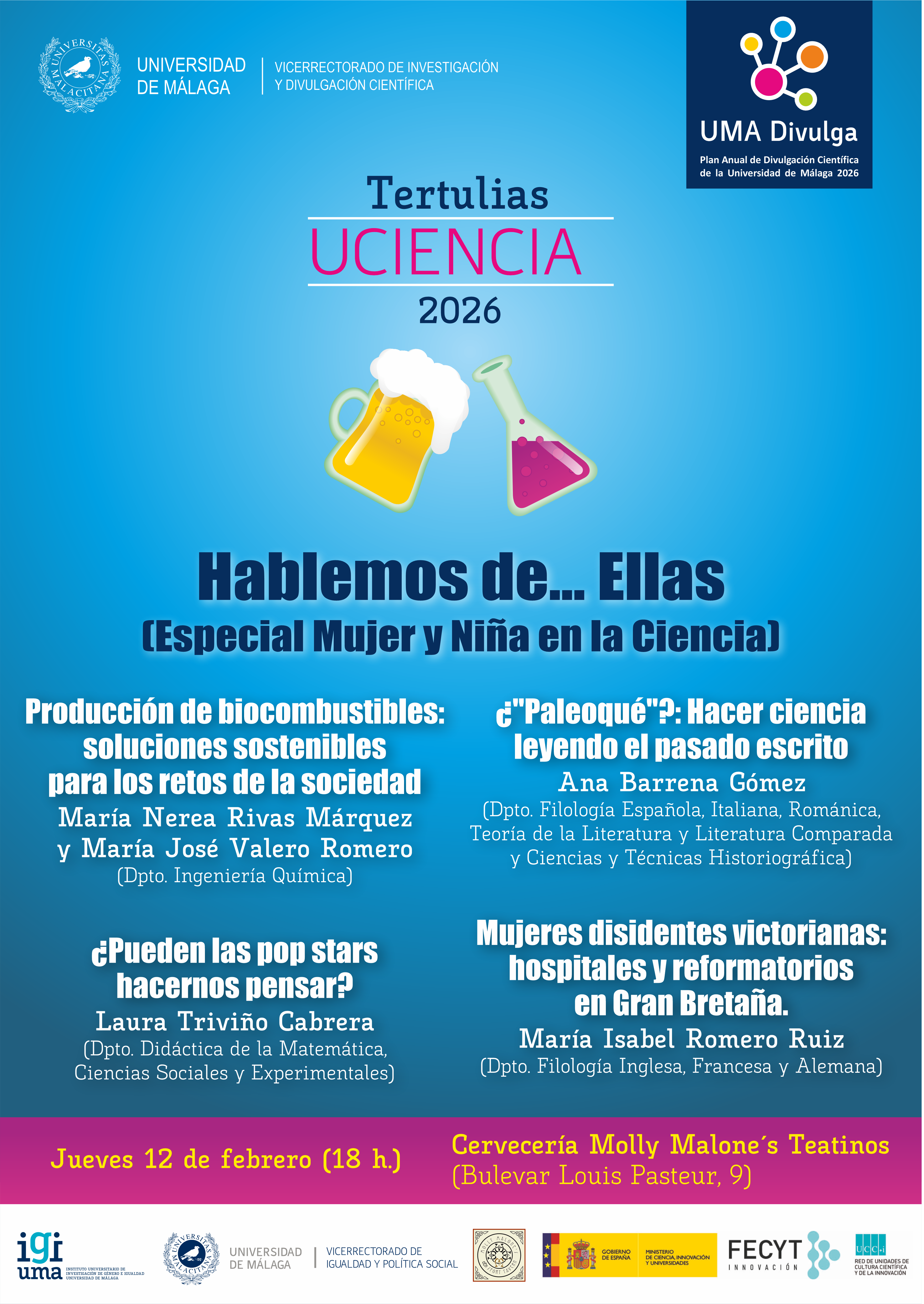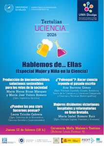 Especial Tertulias Uciencia en el marco del 11F, Día Internacional de la Mujer y la Niña en la Ciencia, donde cinco investigadoras de la Universidad de Málaga (UMA) del área de ciencias, historia, literatura y educación se unirán para acercar su trabajo al público y nos hablarán de su experiencia, sus referentes y compartirán su visión de la carrera académica desde diversos ámbitos de conocimiento. Intervienen: