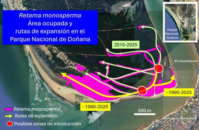 Esta expansión está alterando de forma considerable la vegetación característica, formada principalmente por bosques abiertos de enebros y sabinas, un tipo de hábitat que está protegido por la Unión Europea. A su vez, esta dispersión está modificando el funcionamiento ecológico de estos hábitats, muy sensibles, alterando la composición y abundancia de la vegetación y fauna. La proliferación de la retama -de nombre científico Retama monosperma-, cuya copa puede alcanzar más de diez metros de diámetro y siete de altura, se ha producido en los últimos 30 años, a partir de unos pocos individuos que los guardas plantaron como ornamento alrededor de sus huertas a finales de los años 90. La diseminación de las semillas llevada a cabo por animales herbívoros ha llevado a la retama a colonizar las dunas que se han formado durante el último medio siglo.