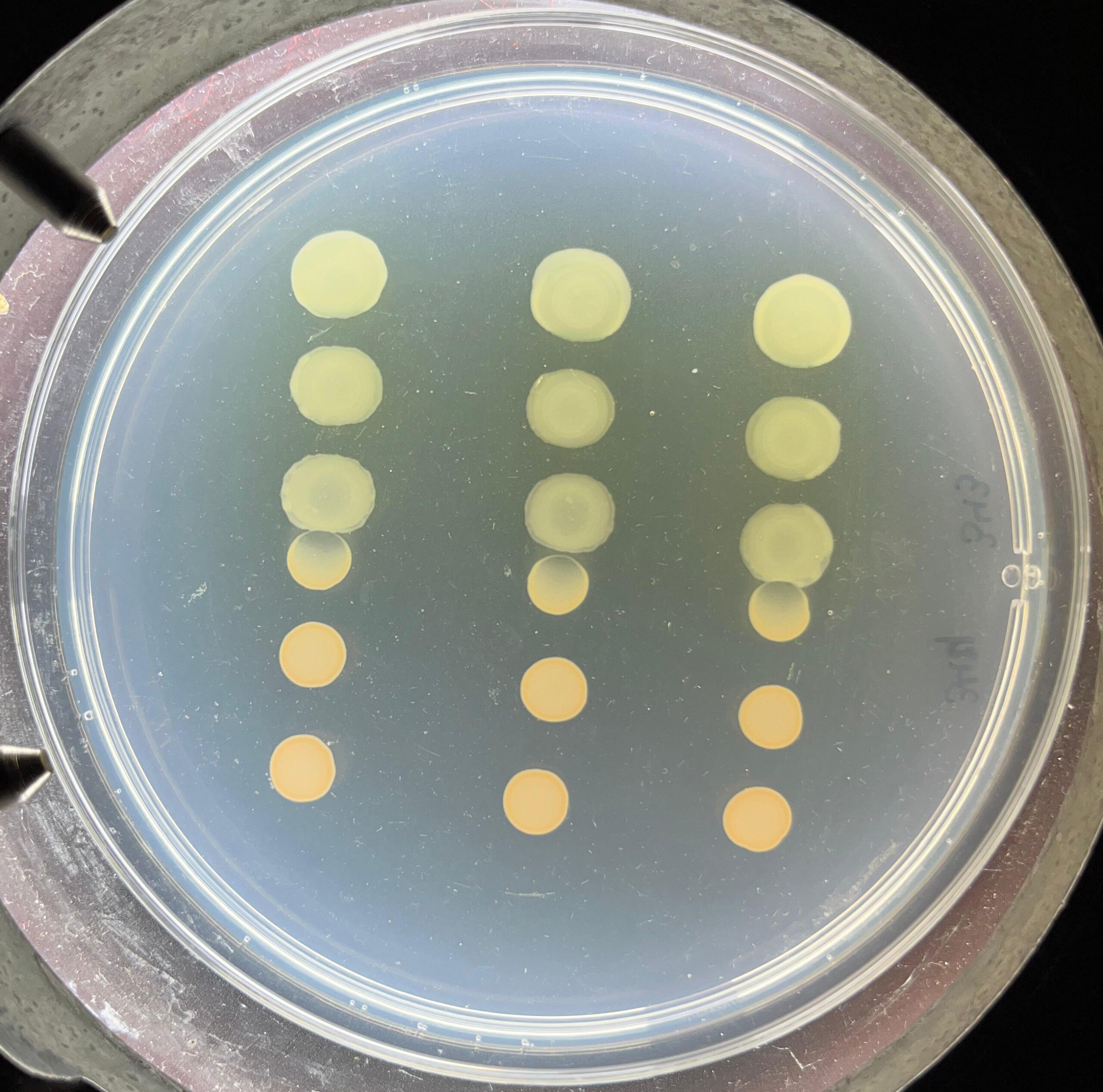 Ensayo de interacciones entre especies bacterianas aislada de plantas de caña de azúcar. Se observa que la proximidad entre colonias de dos especies diferentes inhibe el crecimiento de una de ellas (la de la parte inferior).