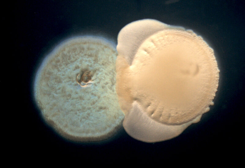 Interacción entre dos especies bacterianas colonizadoras de la raíz de plantas. Se observa como ‘Pseudomonas knackmussii’ (derecha) empieza a crecer sobre la colonia de ‘Stutzerimonas stutzeri’ (izquierda).