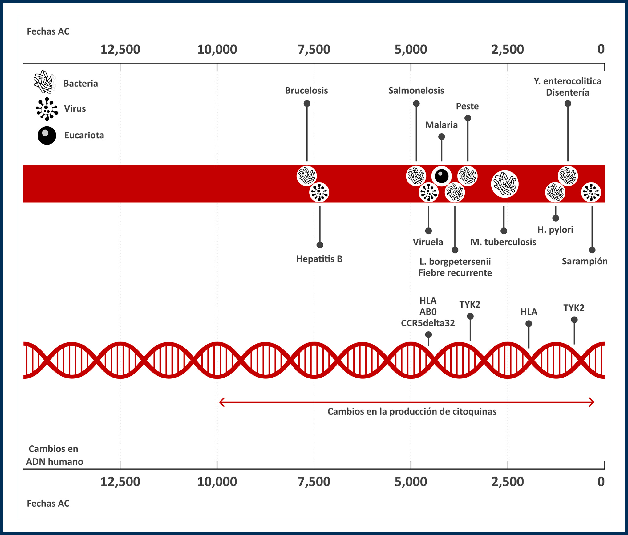 Línea del tiempo que marca el momento de aparición, hasta donde se sabe, de los diferentes patógenos, así como de los cambios en el ADN humano a lo largo del tiempo.