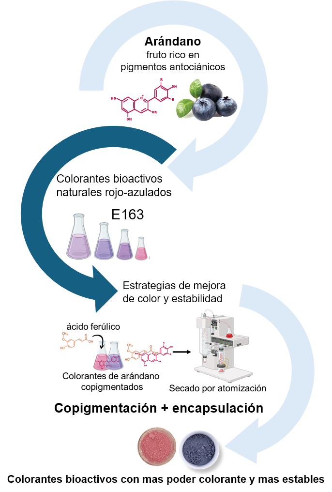 En los últimos años, la industria alimentaria ha buscado reemplazar los colorantes sintéticos por los naturales, con especial interés por las tonalidades rojas y azules, muy demandadas en distintas aplicaciones industriales. Las antocianinas presentes en frutos rojos como el arándano representan una buena alternativa como pigmentos naturales.