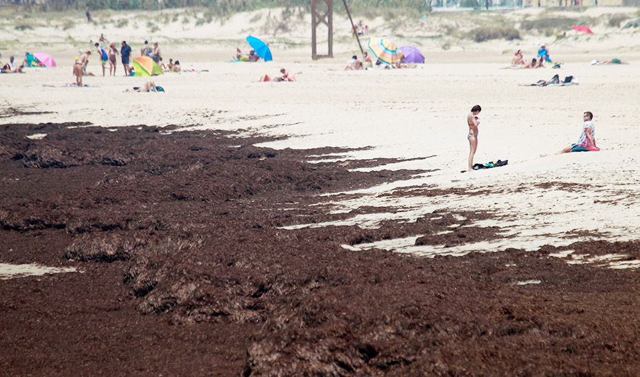 Aspecto que presentaba en 2020 la playa gaditana de Tarifa por la invasión del alga asiática ‘Rugulopterix okamurae’. (Foto Efe)
