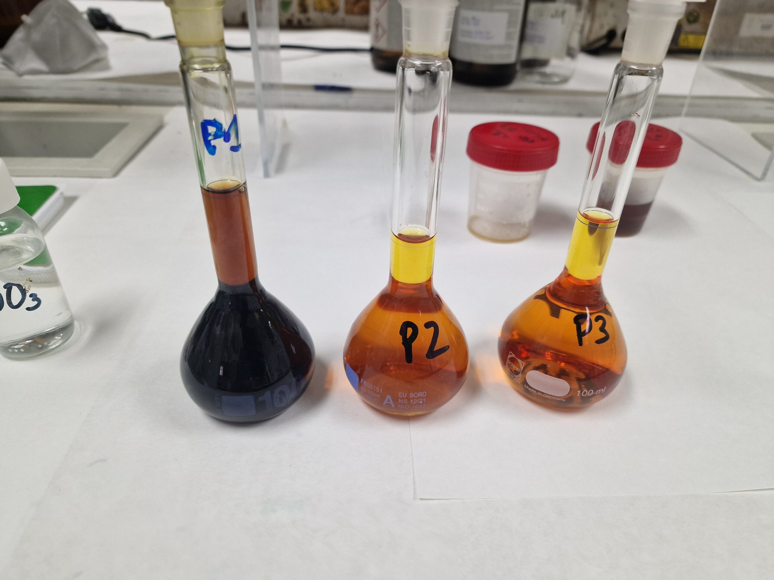 Comparativa del cloruro férrico del equipo de la Universidad de Huelva (izqda.) con 2 cloruros férricos comerciales (centro y derecha).